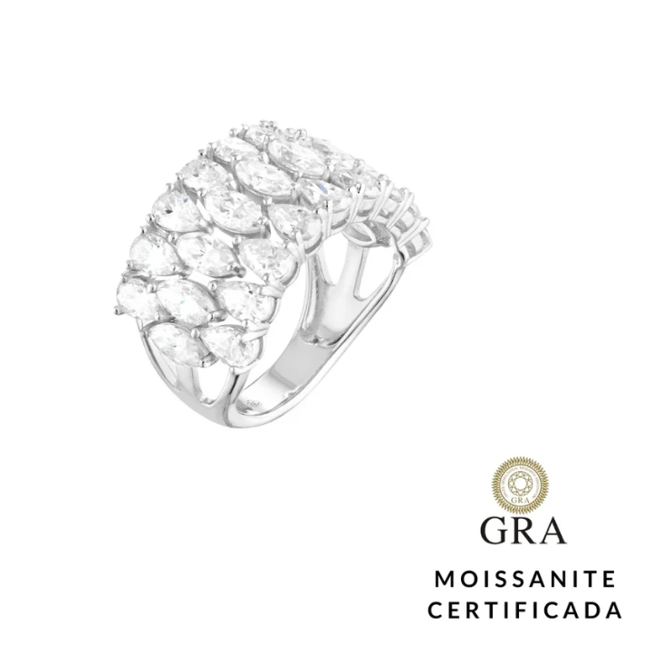 O glamour da Moissanite by Elaine Palma. A Linha Glam une luxo e responsabilidade de forma excepcional. Com pedras que brilham mais que diamantes, a sustentabilidade se destaca: a Moissanite é produzida em laboratório, sem impactos ambientais. Para assegurar a qualidade e autenticidade, cada joia vem com um certificado único, assim como os diamantes, atestando a excelência e o valor de cada gema.