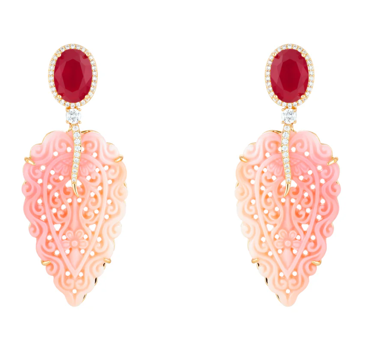Inspirado na delicadeza das folhas e na preciosidade dos oceanos, o Brinco Folha Shell combina o tom profundo do rubi, o brilho das zircônias cristal e a suavidade da madrepérola shell. O banho de ouro 18K realça os detalhes orgânicos da peça, que traduz a conexão entre a força feminina e a essência natural da vida.