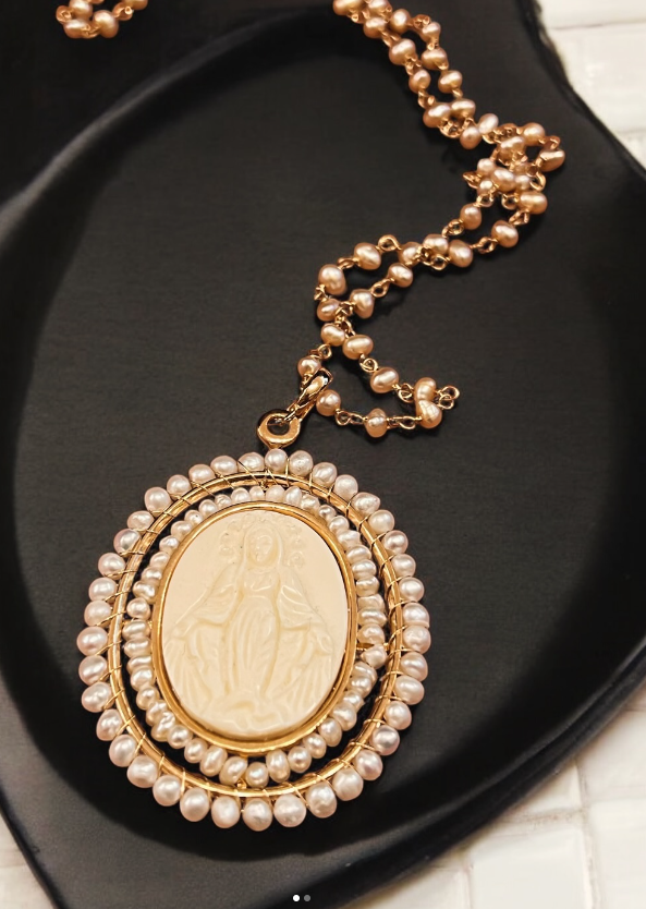 PEDRAS ; PINGENTE BORDADO EM PEROLAS NATURAIS E IMAGEM ESCULPIDA DE NOSSA SENHORA DAS GRAÇAS