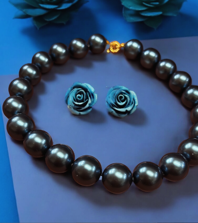 PEDRAS ; COLAR DE PEROLAS AZUIS PINTADAS E BRINCO FLOR DE RESINA