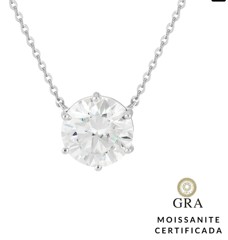 Um clássico reimaginado: colar em prata 925 com banho de ródio, protagonizado por um moissanite de 5 ct. Seu brilho intenso celebra a elegância atemporal e o poder de renascer com estilo.